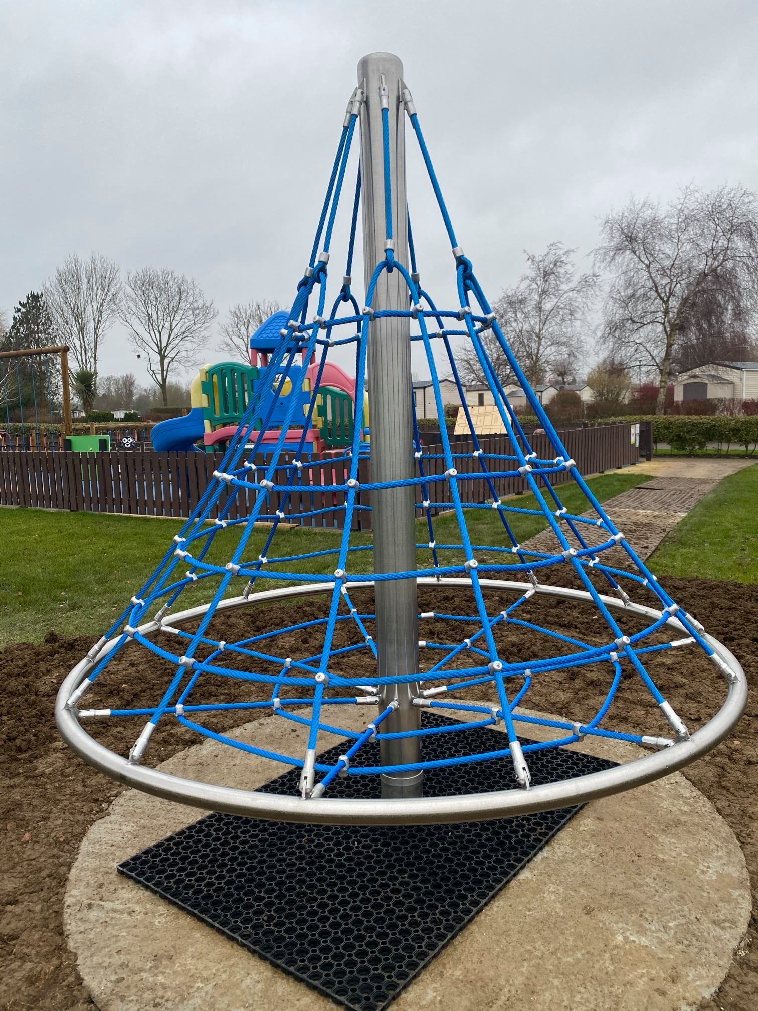 The "Witches Hat" or also known as the "Cone Climber" has been installed. Either way, the Cone Climber has been a great addition to the Play Area. The rotating net play will have children in a spin! The Cone Climber is great for multi-play as they climb to the top of the rotating net. Ideal for children aged three to twelve.