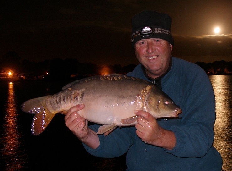 This shot of a 3am Swan Lake mirror carp was self-taken using my camera set on 'night mode' to capture the amazing moon in the background but the flash set to 'On' to illuminate me and the fish. Very pleased with the result.