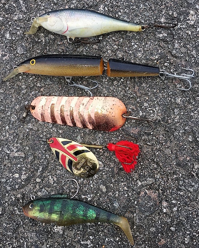 A selection of lures that I use including a solid Rapala Shad Rap plug, a Rapala medium diving jointed plug, an copper Abu Atom spoon, an gold Ondex spinner and a Berkley soft plastic perch pattern Shad