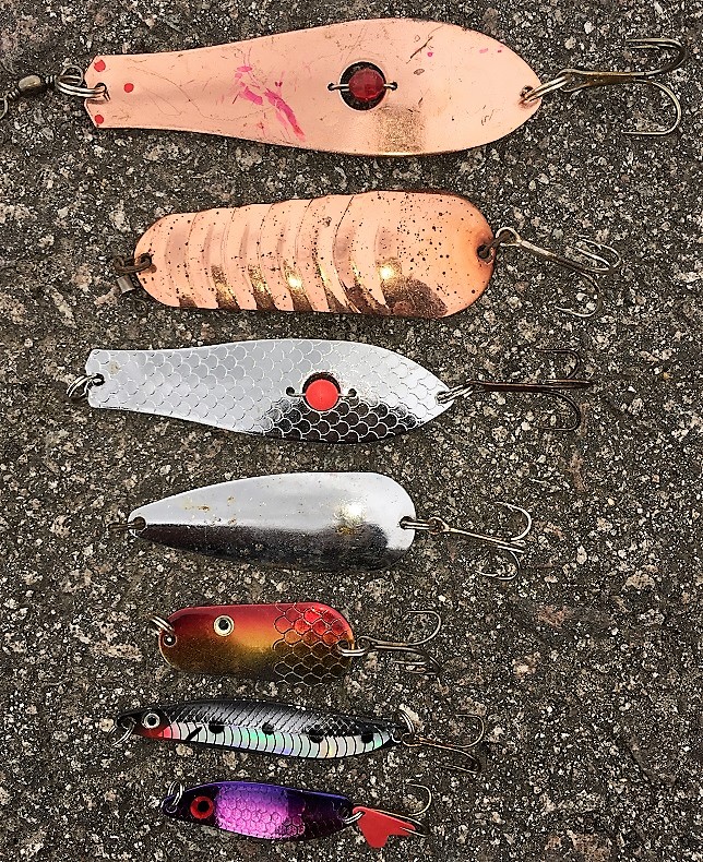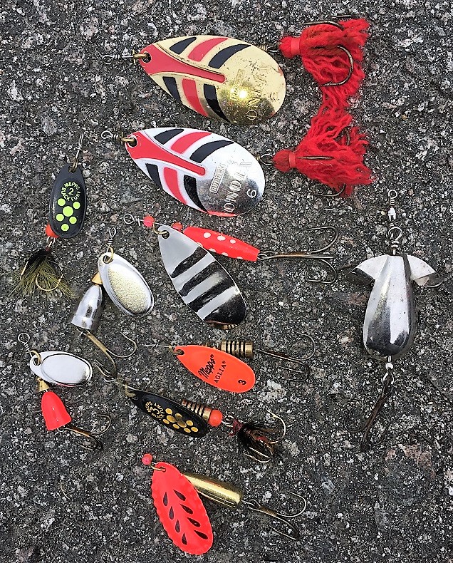 A selection of my favourite 'spinners' including the larger Ondex and the smaller Mepps Aglia - note on the right is a very old school Colorado spinner