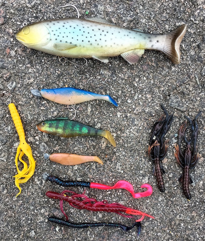 A selection of soft plastics including an 8" trout pattern swim bait, crayfish and other weird and wonderful creature baits - however the 3 'shad' patterns in the centre of the picture are very effective