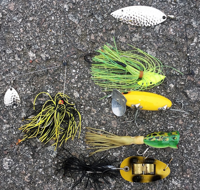A selection of 'poppers' and 'spinnerbaits' including a favourite yellow surface 'Jitterbug'