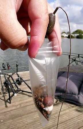 Start by filling the pva bag with a pellet/boilie crumb mix, then put in your hook bait and more of the mix, followed by the lead